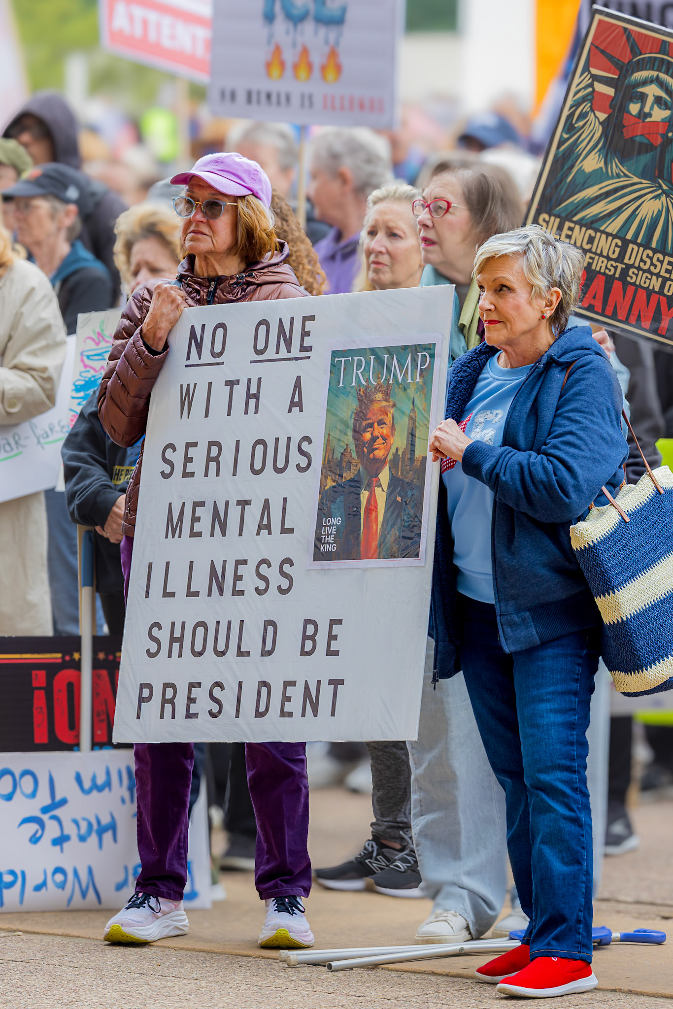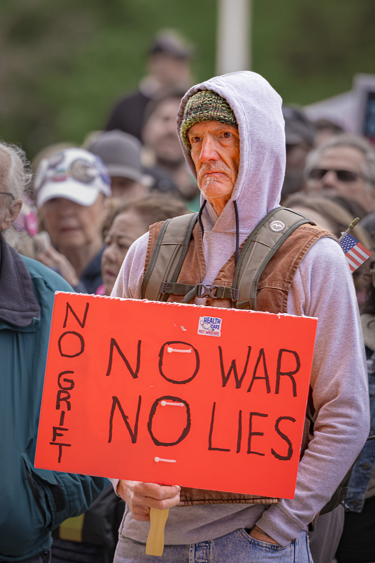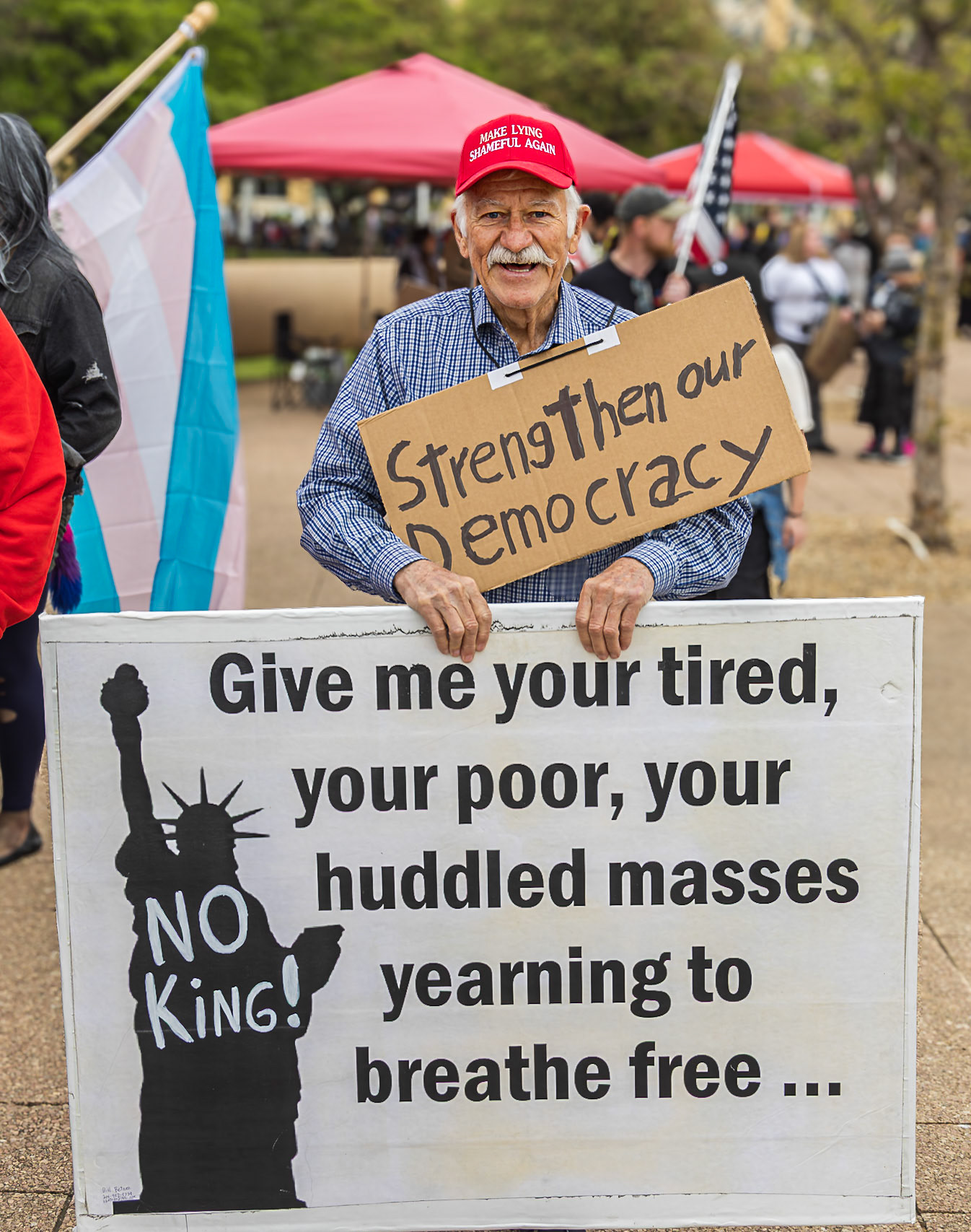 A random selection of some of the 2000+ people who attended the "No Kings" demonstration and the mostly home-made signs they brought with them. (Click on any image to fill your screen with the image, then click on left or right side of screen to advance to next image)