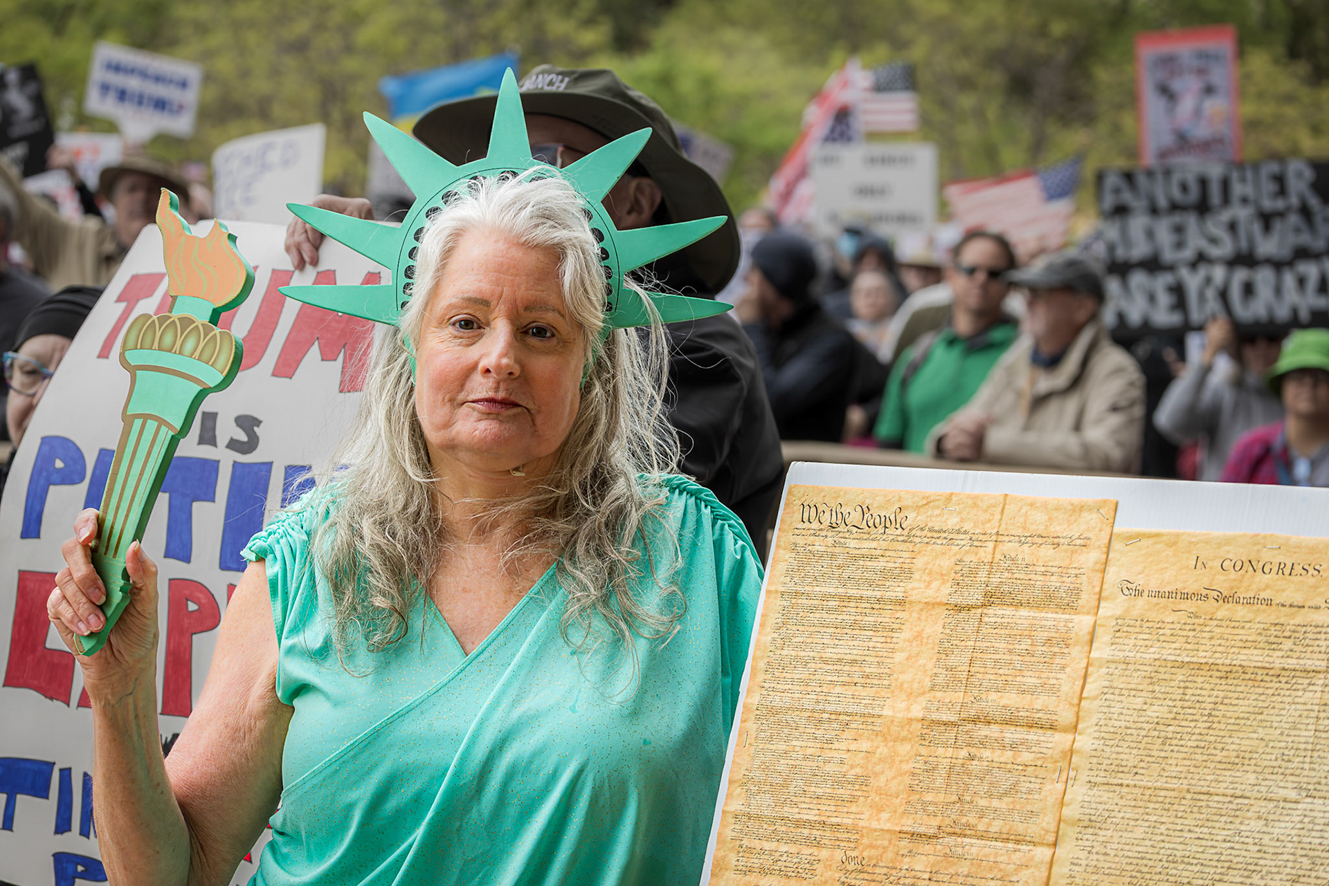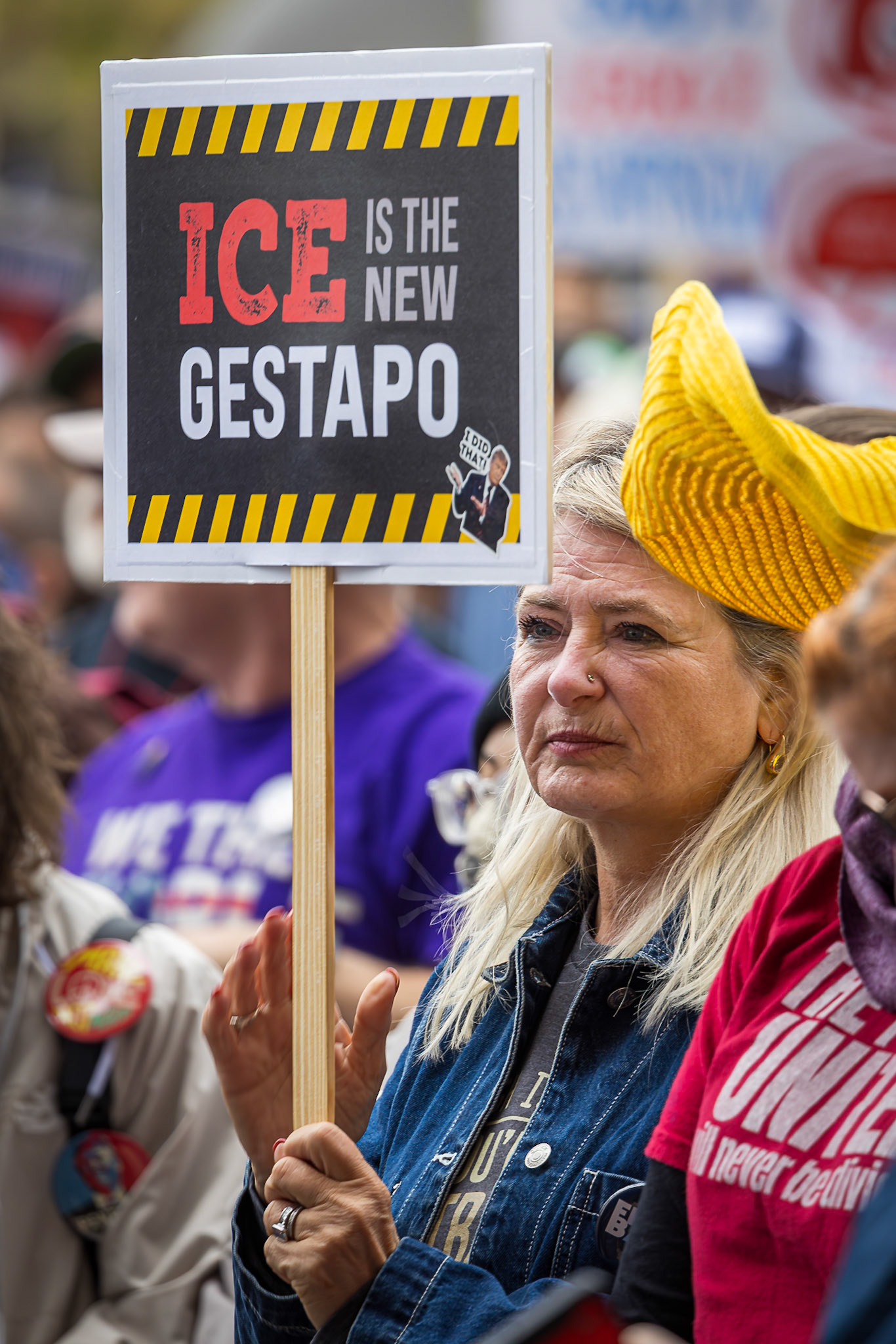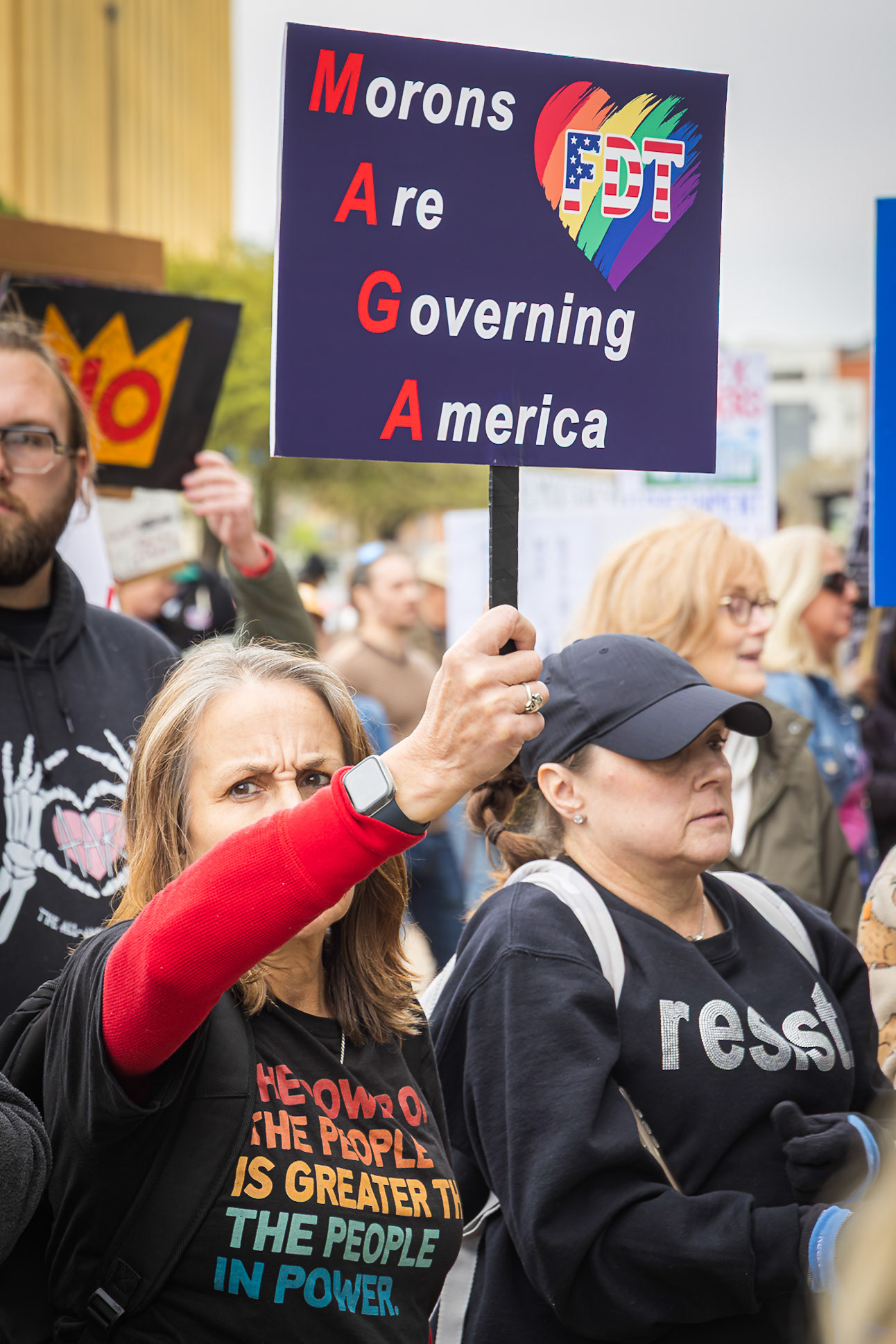 A random selection of some of the 2000+ people who attended the "No Kings" demonstration and the mostly home-made signs they brought with them. (Click on any image to fill your screen with the image, then click on left or right side of screen to advance to next image)