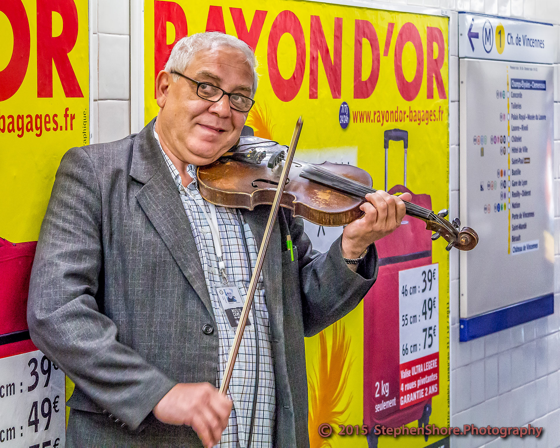 A busker playing under the street in the Paris Metro